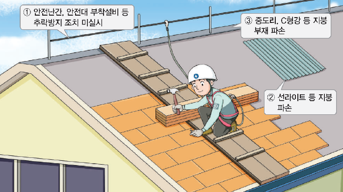 > 지붕은 안전화의 마찰력으로 버티지 못해 미끄러질 확률이 매우 높습니다. 그렇기 때문에 항상 고소작업 시에는 추락에 대비하기 위한 대책으로 추락 방지망 및 안전로프를 설치해 안전하게 하강할 수 있도록 조치를 취한 후 작업을 실시하여야 해당 사례의 사고가 발생하지 않습니다.